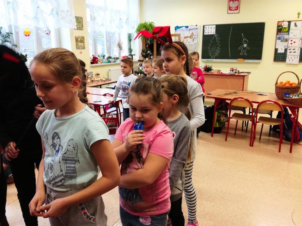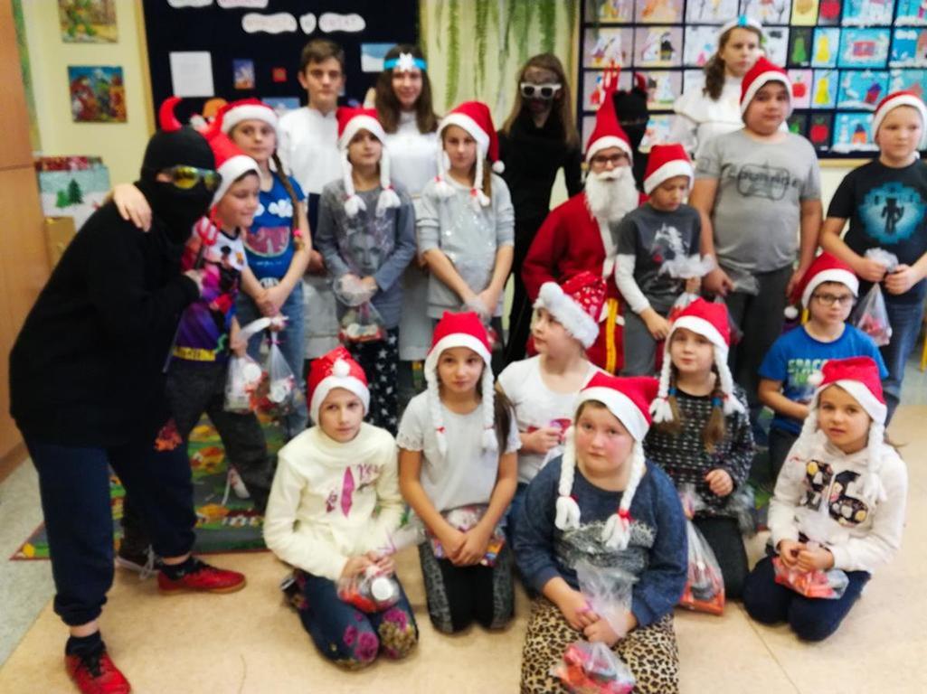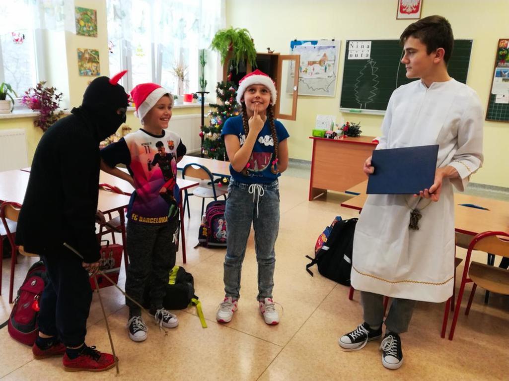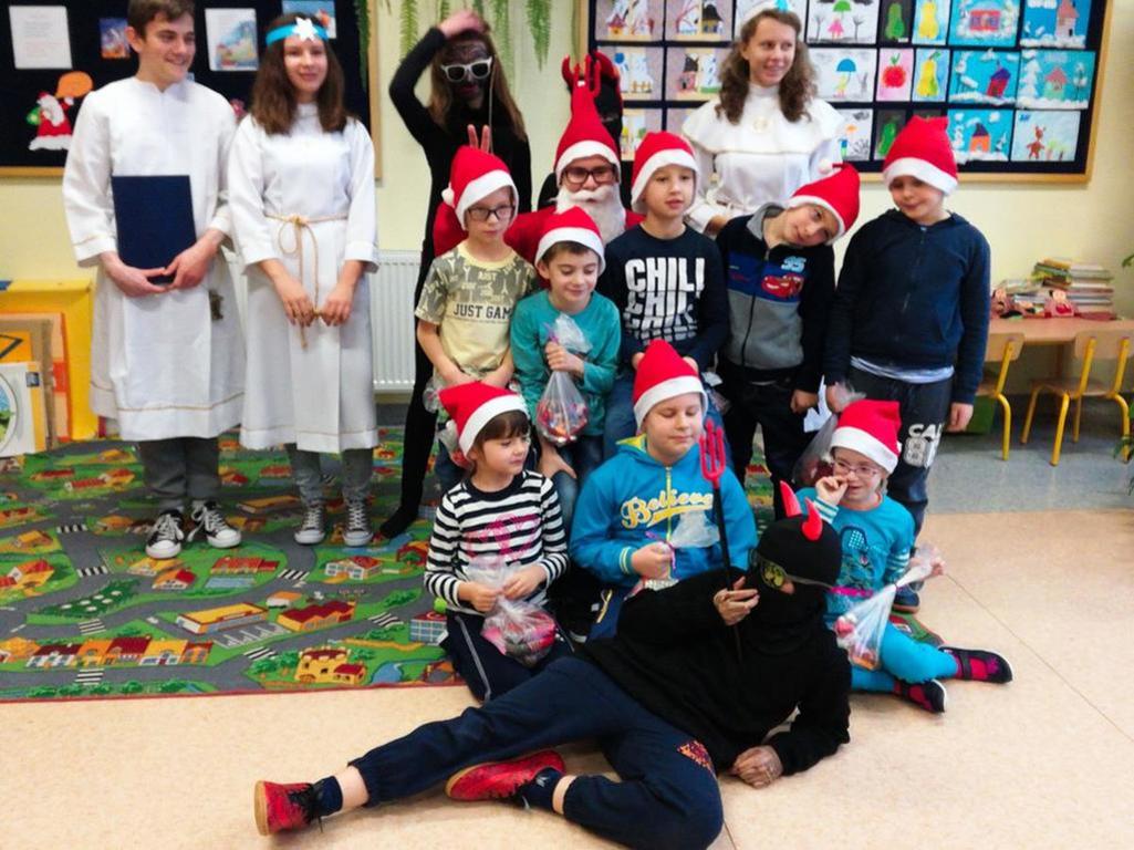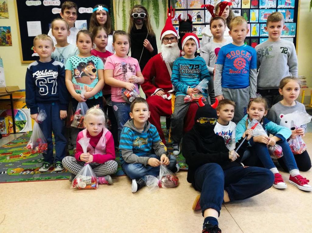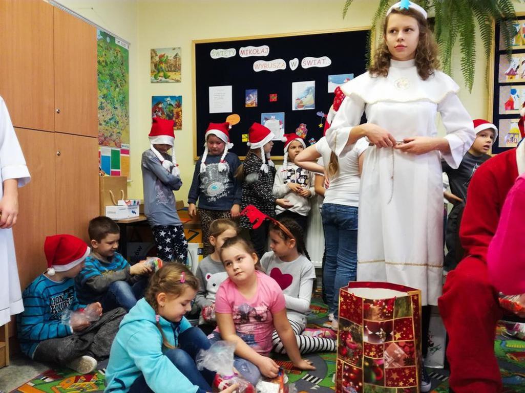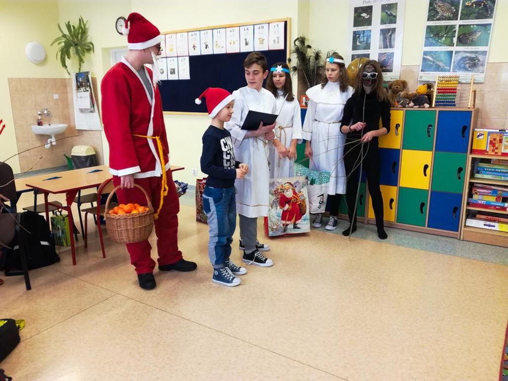 Tradycyjnie, jak co roku o tej porze zjawił się długo oczekiwany gość – Mikołaj. Dzieci powitały go serdecznie. Recytowały wiersze, śpiewały piosenki. Pomocnicy Mikołaja przygotowali dla wszystkich dzieci i nauczycieli ciekawe pytania i konkursy. Wszyscy zostali obdarowani prezentami, owocami i słodyczami. Dzieci bardzo ucieszyły się z tej wizyty. Na ich twarzach było widać radość, wielkie wzruszenie i zadowolenie. Mikołaj nie zapomniał również o starszych uczniach naszej szkoły. Także i dla nich znalazły się upominki.
