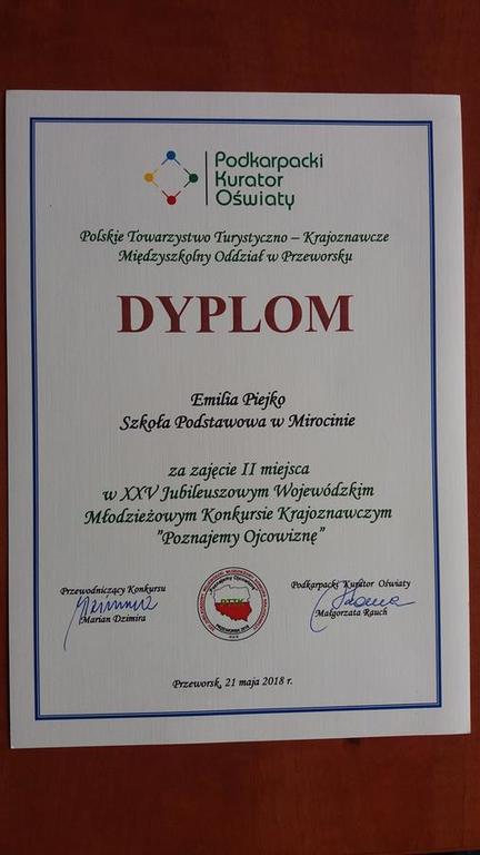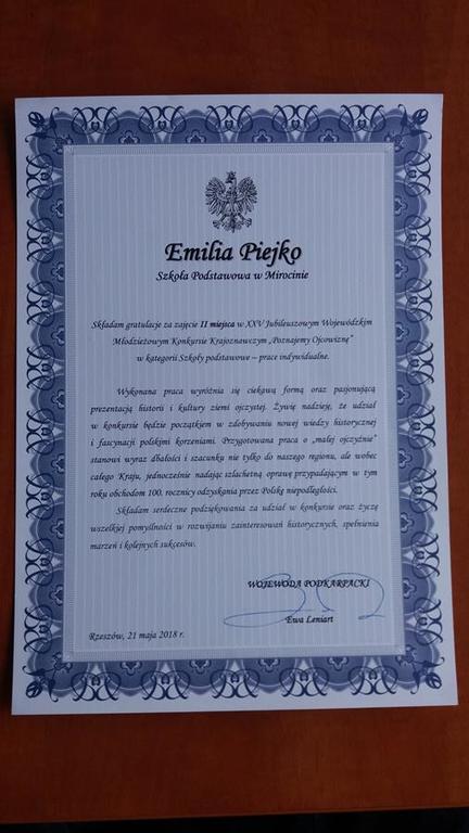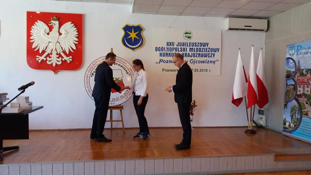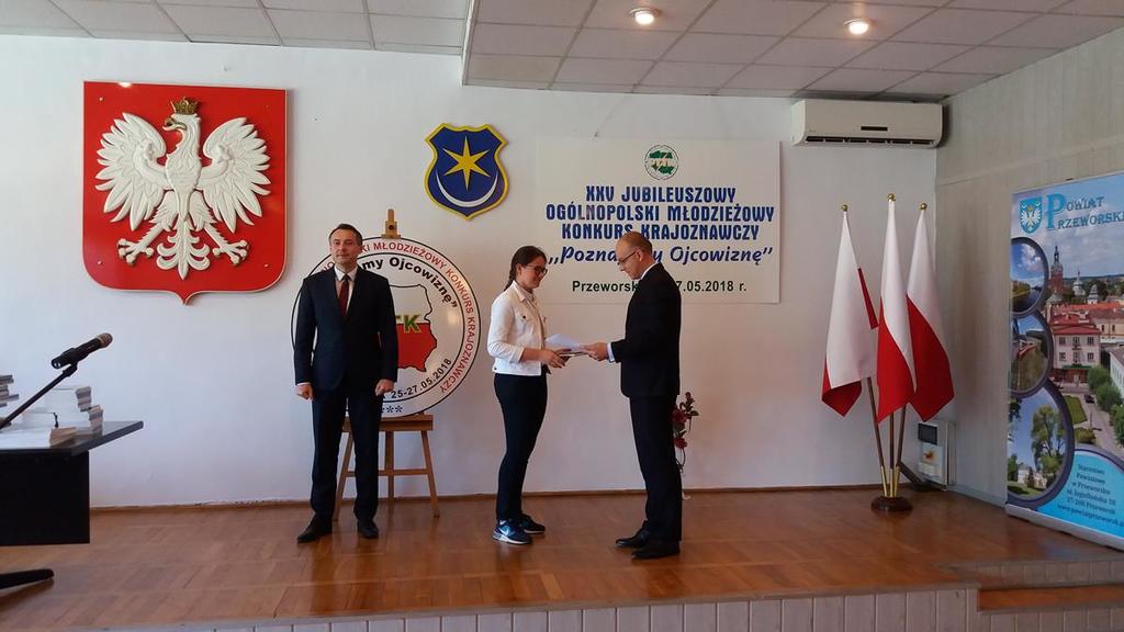 W dniu 21 maja w Starostwie Powiatowym w Przeworsku odbyło się uroczyste podsumowanie XXV Jubileuszowego Wojewódzkiego Młodzieżowego Konkursu Krajoznawczego „Poznajemy Ojcowiznę”. Po raz drugi wzięła w nim udział nasza uczennica, Emilia Piejko, która również w tym roku zdobyła wysoką lokatę – II miejsce. W tegorocznej edycji Emilia w swojej 30-stronicowej pracy opisała życie i działalność swojego przodka – Jana Jankowskiego – wielkiego człowieka i patrioty. Praca ta pięknie wpisuje się w obchody 100-lecia odzyskania przez Polskę niepodległości. Konkurs ten objęła swoim patronatem Podkarpacka Kurator Oświaty. Serdecznie gratulujemy i życzymy dalszych sukcesów!!!