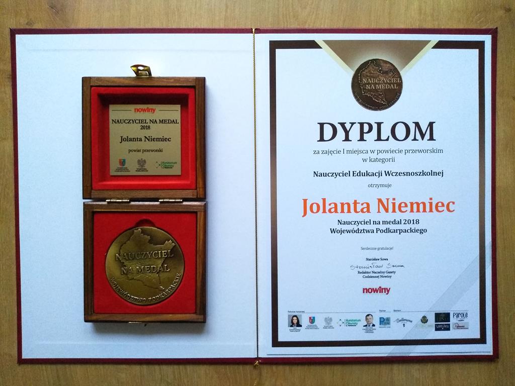 27 października podczas konferencji zorganizowanej przez Podkarpackie Centrum Edukacji Nauczycieli w Centrum Wystawienniczo - Kongresowym w Jasionce wręczono nagrody laureatom plebiscytu „Nauczyciel na medal”. Z przyjemnością informujemy, że wśród laureatów była nauczycielka naszej szkoły Pani Jolanta Niemiec, która zajęła I miejsce w powiecie przeworskim w kategorii Nauczyciel Edukacji Wczesnoszkolnej. Cieszymy się z sukcesu naszej koleżanki, że znalazła się w gronie najbardziej cenionych i lubianych nauczycieli w województwie podkarpackim. Wyróżnienie to zawdzięcza Rodzicom oraz Uczniom, którzy zgłosili ją do plebiscytu, a później gorąco wspierali swoimi głosami, dając dowód wielkiego uznania i sympatii. Dlatego dziękujemy wszystkim, biorącym udział w akcji, a Pani Jolancie Niemiec życzymy kolejnych sukcesów w pracy dydaktyczno-wychowawczej.