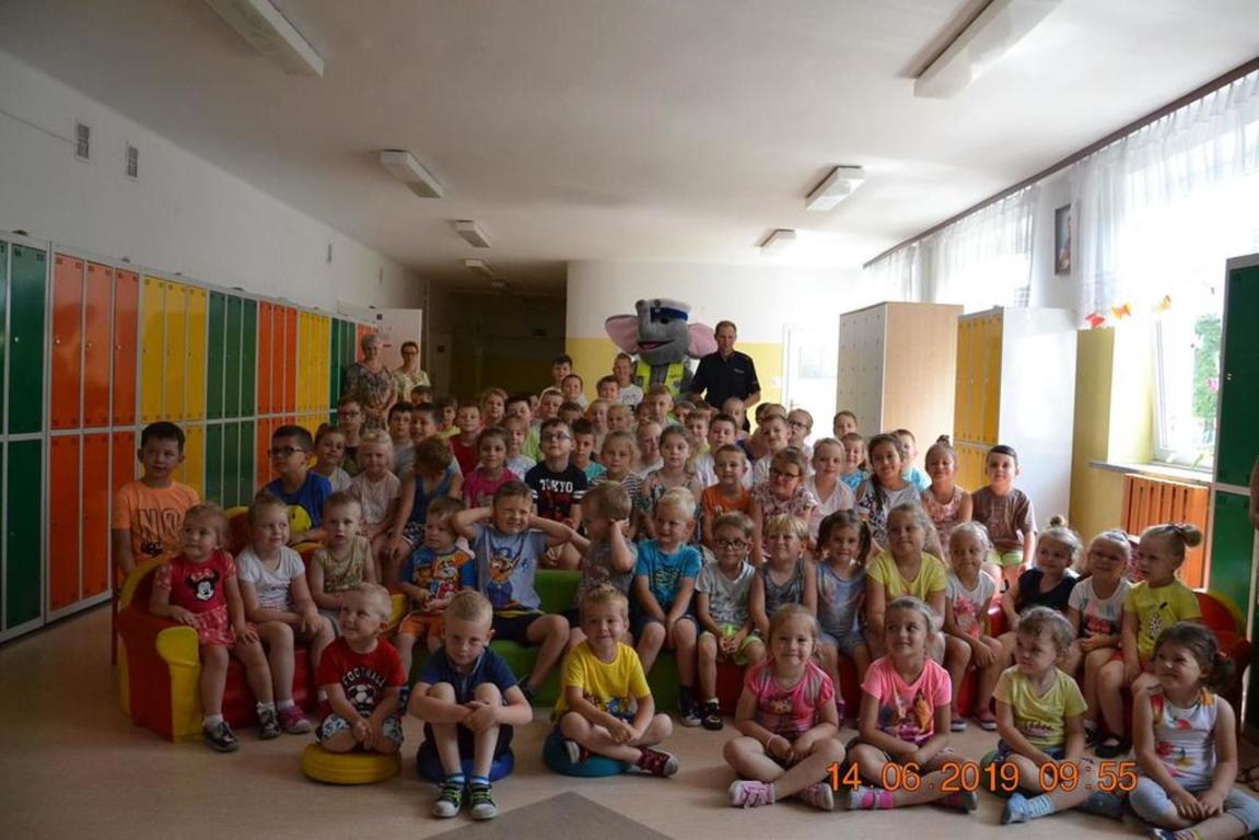 W piątek 14 czerwca gościliśmy w naszej szkole Pana Policjanta, który spotkał się z przedszkolakami i uczniami edukacji wczesnoszkolnej, aby porozmawiać z nimi na temat bezpiecznych wakacji. Pan Policjant przywiózł ze sobą niezwykłego gościa: „Funkcjonariusza Słonia”, który towarzyszy mu podczas spotkań z dziećmi wywołując na ich twarzach mnóstwo radości. Jednak najważniejszym powodem spotkania była rozmowa na temat bezpieczeństwa w wakacje. Pan Policjant przedstawił dzieciom potencjalne niebezpieczne sytuacje, które mogą zdarzyć się w czasie wakacyjnego wypoczynku i razem z dziećmi omówił sposoby na ich uniknięcie. Rozmowa dotyczyła bezpieczeństwa nad wodą, w lesie, na drodze, na podwórku i placu zabaw oraz w domu. Okazało się, że nasze dzieciaki mają bardzo dużą wiedzę na ten temat, dlatego Pan Policjant zwrócił szczególną uwagę na umiejętność wykorzystania tej wiedzy w praktyce. Następnie odbyło się uroczyste wręczenie nagród uczestnikom szkolnego konkursu plastycznego „Bezpieczne wakacje”.