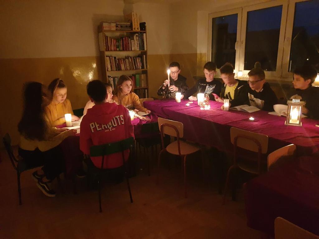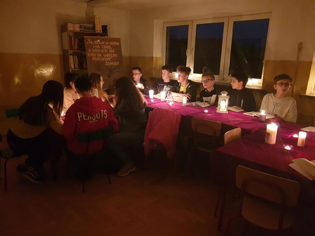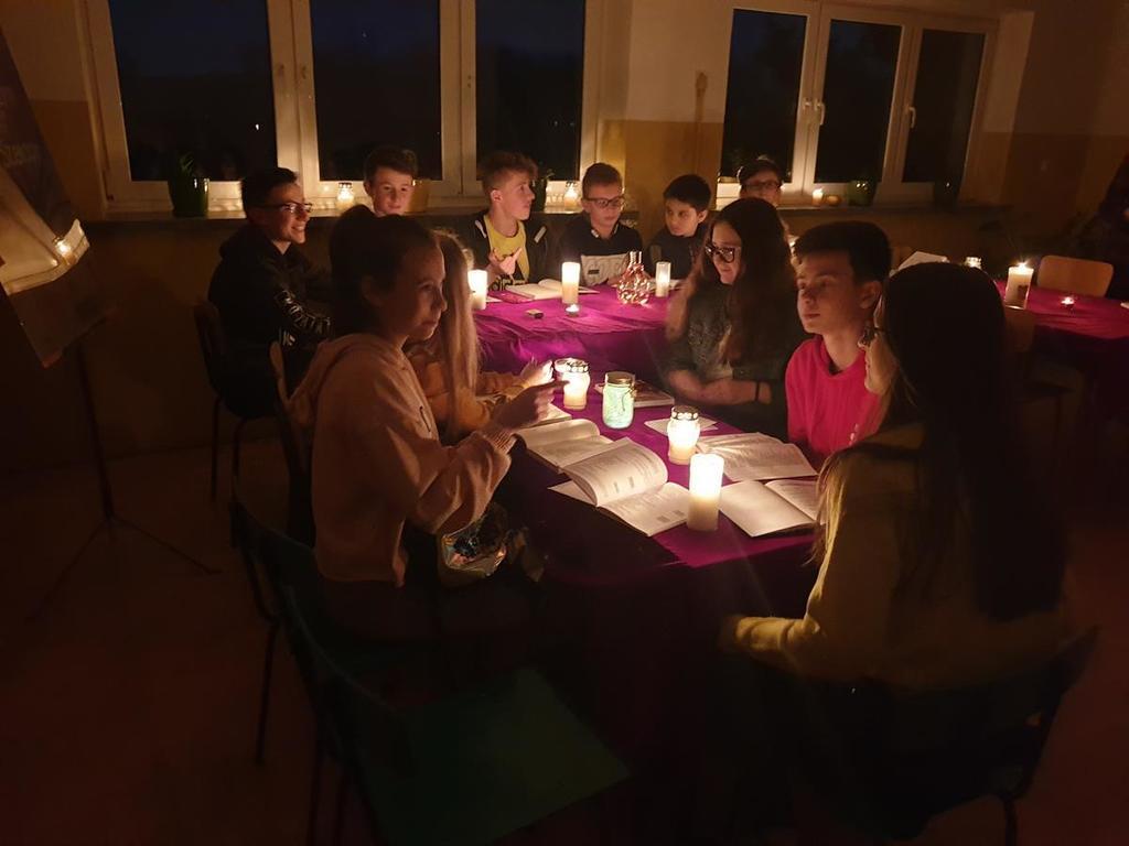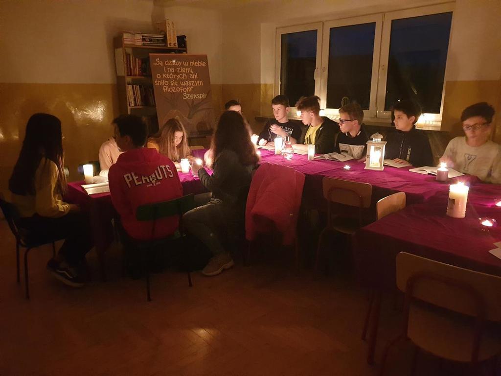 W listopadowy wieczór w murach naszej szkoły miało miejsce niecodzienne wydarzenie – WIECZORNE CZYTANIE „DZIADÓW CZ.II”. Uczniowie klas siódmych i ósmych spotkali się w bibliotece szkolnej, by wspólnie zapoznać się z treścią dramatu Adama Mickiewicza. W aurze listopadowej nocy i atmosferze niedawnego Święta Zmarłych pochylili się nad utworem wieszcza w pełnym skupieniu. Taki sposób wspólnego poznawania lektury przypadł uczniom do gustu, bo frekwencja była prawie stuprocentowa. Trzeba również stwierdzić, że tak żywe czytanie dramatu Mickiewicza skłania do zastanowienia się nad tym, co w życiu człowieka jest ważne.