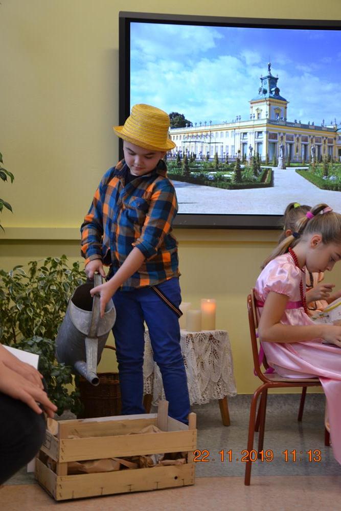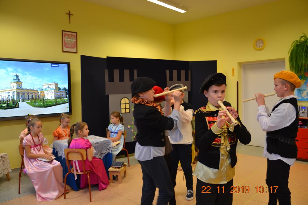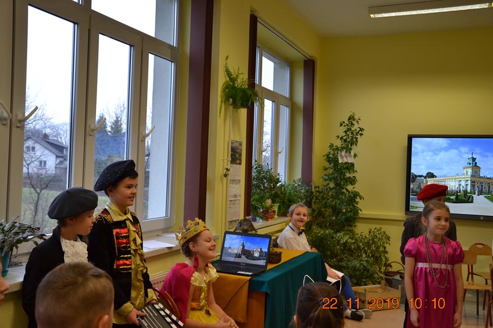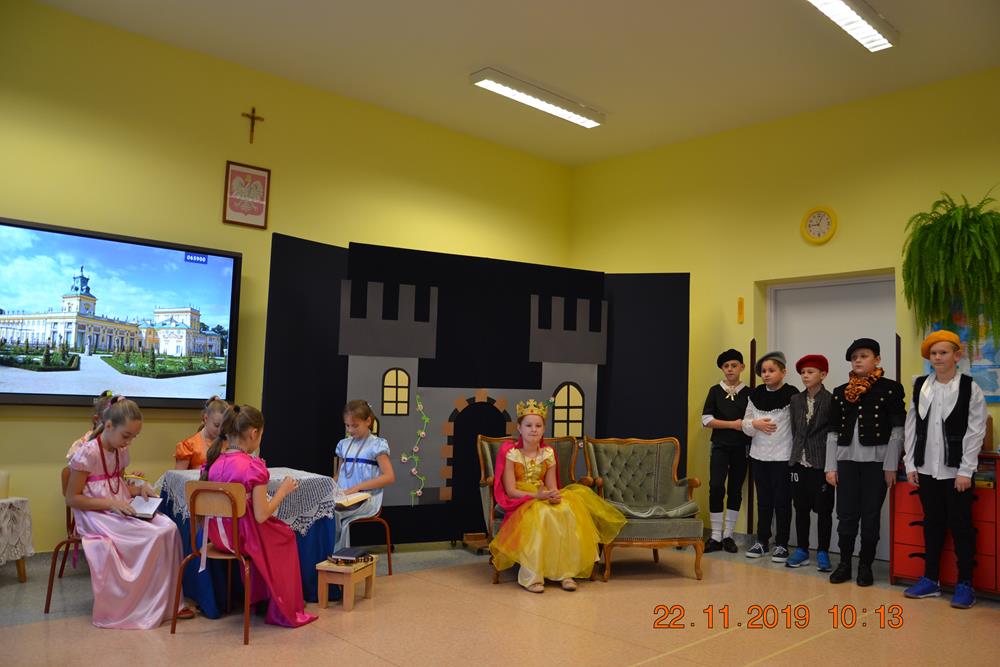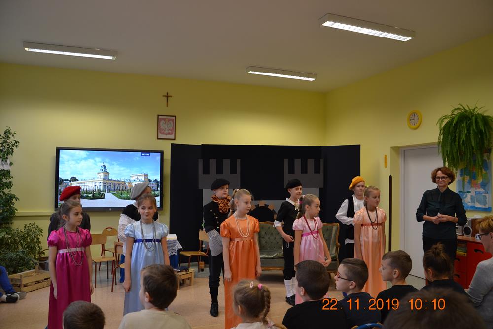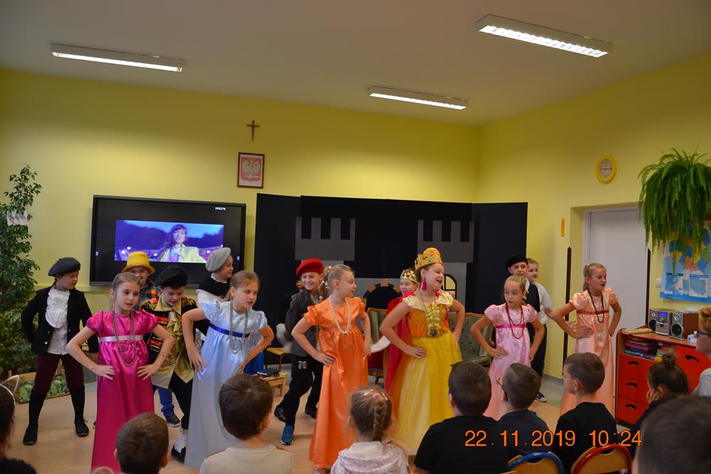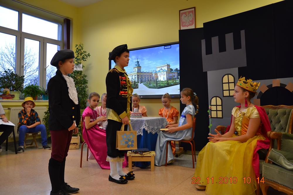 W czasach panowania króla Jana III Sobieskiego i królowej Marysieńki, kiedy na dworach odbywały się liczne bale i przyjęcia, a król dzielnie walczył z Turkami pod Wiedniem, posłaniec przywiózł podarunek dla królowej od męża – ziemniaki. Warzywo to wówczas zupełnie nieznane w Polsce, dziś stanowi podstawę bardzo wielu potraw. O tym właśnie mogli dowiedzieć widzowie spektaklu teatralnego „Podarunek królewski” w wykonaniu uczniów klasy III. Uczniowie oprócz przedstawienia okoliczności sprowadzenia do Polski ziemniaka, zaprezentowali też piękne tańce dworskie. Na zakończenie, chcąc przywołać naszą widownię, znów do 2019 roku aktorzy wykonali w strojach dworskich współczesny taniec, wykorzystując fragmenty utworu Viki Gabor „Superhero”, który zwyciężył w tegorocznym finale Eurowizji Junior w Gliwicach. Dziękujemy naszej licznie zgromadzonej publiczności (22 listopada – klasy I, II, IV oraz przedszkole, 26 listopada – rodzice uczniów klasy III) za aplauz i wyrazy uznania. Cieszymy się, że podróż wraz z nami w odległe czasy dostarczyła wielu pozytywnych wrażeń.