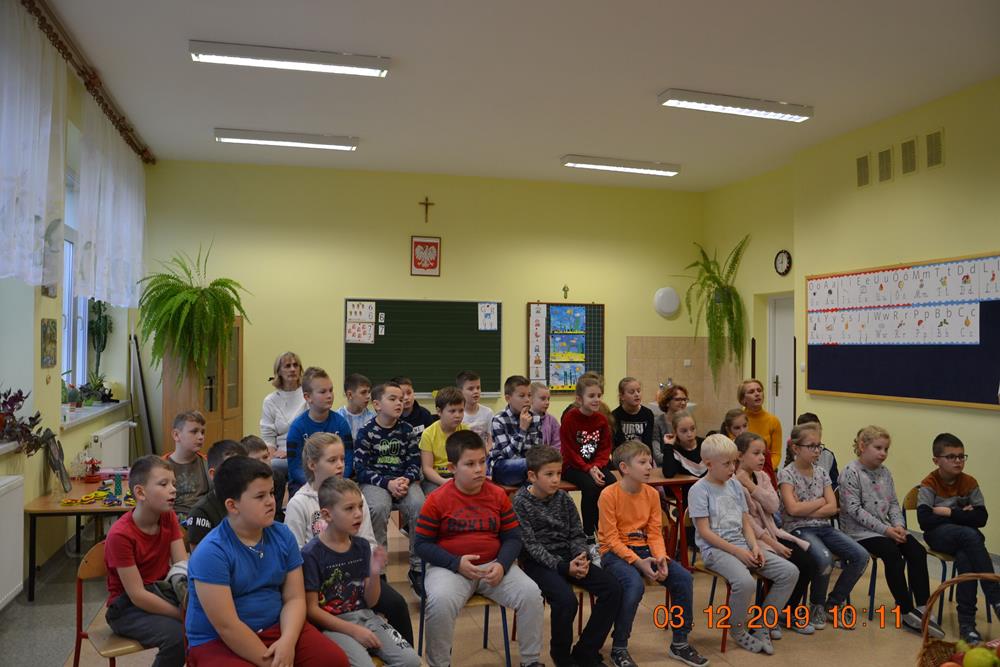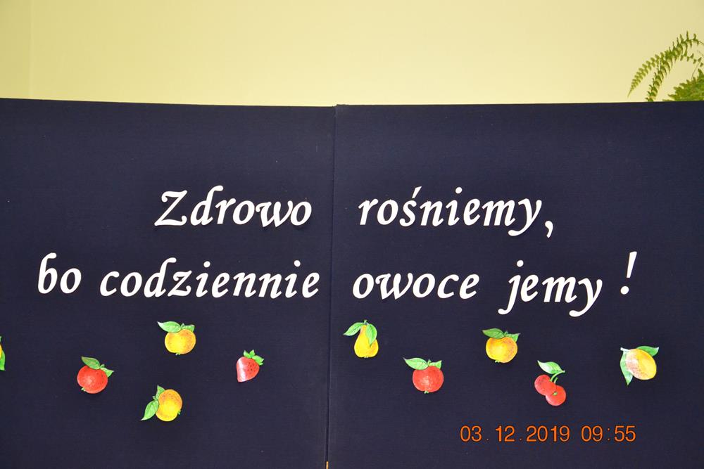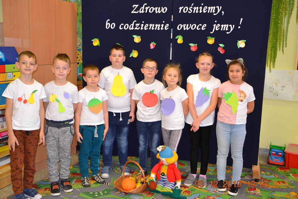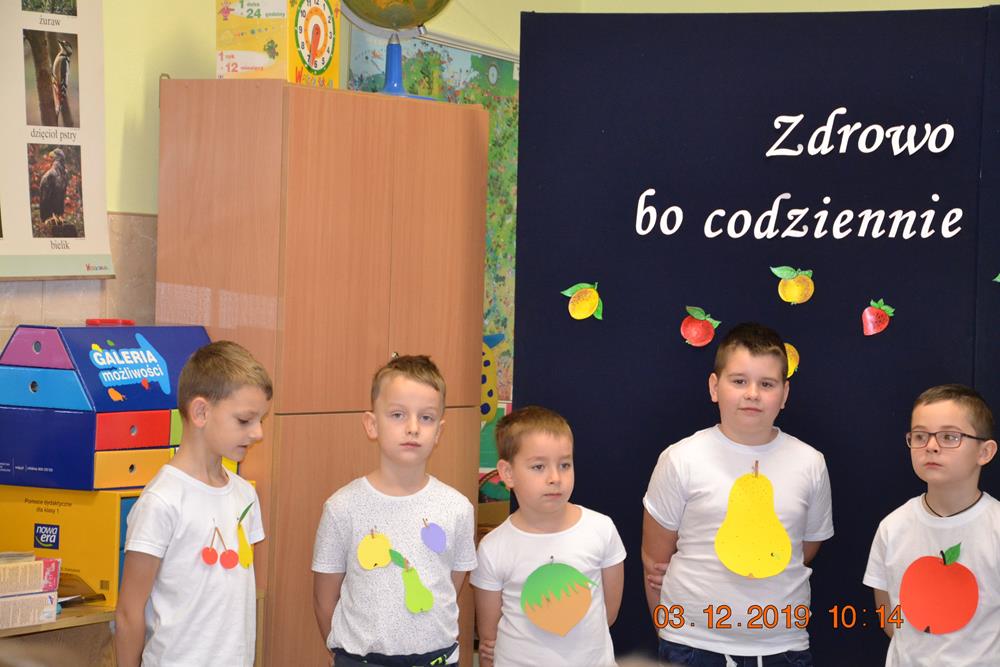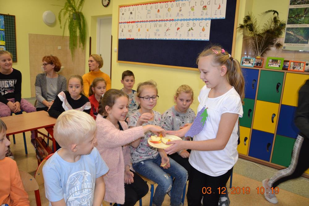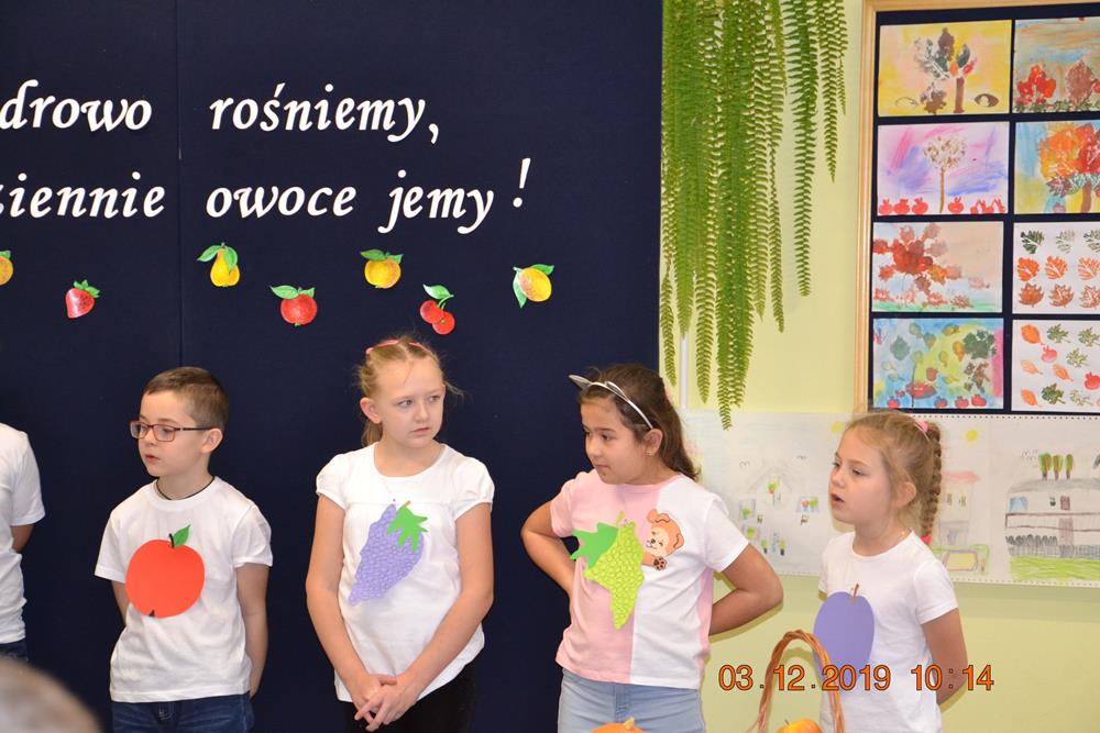 W dniu 3 grudnia 2019 r. uczniowie klasy I zaprosili starszych kolegów i koleżanki z edukacji wczesnoszkolnej na krótkie przedstawienie pt. „Między nami owocami”. Uczniowie wcielili się w role owoców (m.in. jabłko, gruszka, śliwka, orzech czy winogron) i podczas rozmowy między sobą przypominali naszej widowni jak wiele korzyści niesie ze sobą spożywanie owoców zwłaszcza w okresie jesienno – zimowym. Teatrzyk ten jednak, choć krótki niósł ze sobą jeszcze jedno ważne przesłanie: nikt nie jest idealny, każdy ma jakieś wady, ale mimo to wszyscy jesteśmy bardzo ważni, potrzebni i na swój sposób wyjątkowi, nie powinniśmy więc oceniać innych za ich niedoskonałości tylko podkreślać i zauważać ich zalety. Na zakończenie uczennice klasy I poczęstowały wszystkich widzów pysznymi, pełnymi witamin jabłkami. Dziękujemy naszej wspaniałej publiczności za gromkie brawa i wyrazy uznania.