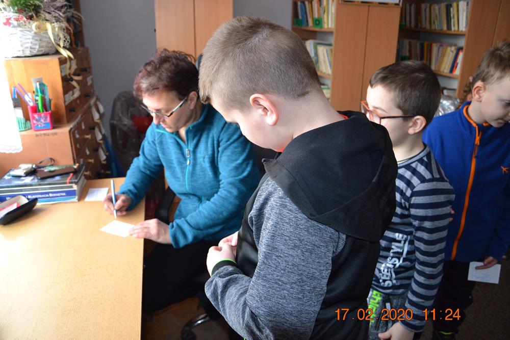 17 lutego uczniowie klasy I odwiedzili Gminną Bibliotekę Publiczną w Mirocinie. Pani Beata Stęchły pracująca w tej placówce zapoznała uczniów z bogatą ofertą książek dla dzieci dostępnych w bibliotece oraz zasadami korzystania z wypożyczalni, jak również przypomniała dlaczego należy szanować książki. Uczniowie mieli okazję obejrzeć interesujące ich bajki i książki oraz dopytać o tytuły, których nie udało im się znaleźć na półkach. Jednak najważniejszym celem wizyty w bibliotece było zapisanie się uczniów klasy I do grona czytelników.