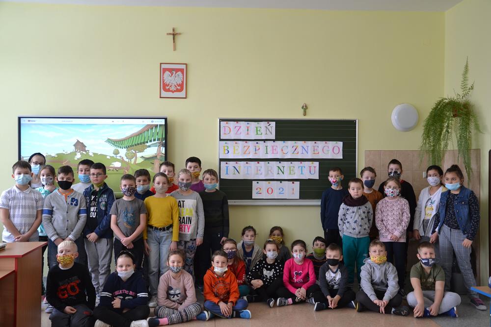 9 lutego obchodzony jest Dzień Bezpiecznego Internetu. To doskonała okazja, aby poszerzyć wiedzę uczniów na temat bezpiecznego i odpowiedzialnego korzystania z nowoczesnych technologii – Internetu. Uczniowie edukacji wczesnoszkolnej w związku ze stacjonarnym nauczaniem brali udział w pogadance na temat zagrożeń internetowych, na które mogą być narażone dzieci z klas I –III. Oczywiście, nie zabrakło również rozmowy na temat korzyści płynących z podłączenia do sieci, których też jest bardzo wiele i o tym nie można zapominać, jednak ważne jest, aby korzystając z Internetu mieć świadomość zagrożeń i wiedzieć jaki się przed nimi bronić. Uczniowie obejrzeli i omówili film „Tysiąc przyjaciół” na temat wirtualnych przyjaźni i zgodnie stwierdzili, że bardziej wartościowe, a przede wszystkim bezpieczniejsze są przyjaźnie zawierane „twarzą w twarz”. Na koniec przygotowali hasło związane z tym dniem , które stało się tłem do wspólnej fotografii.