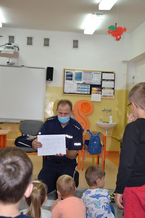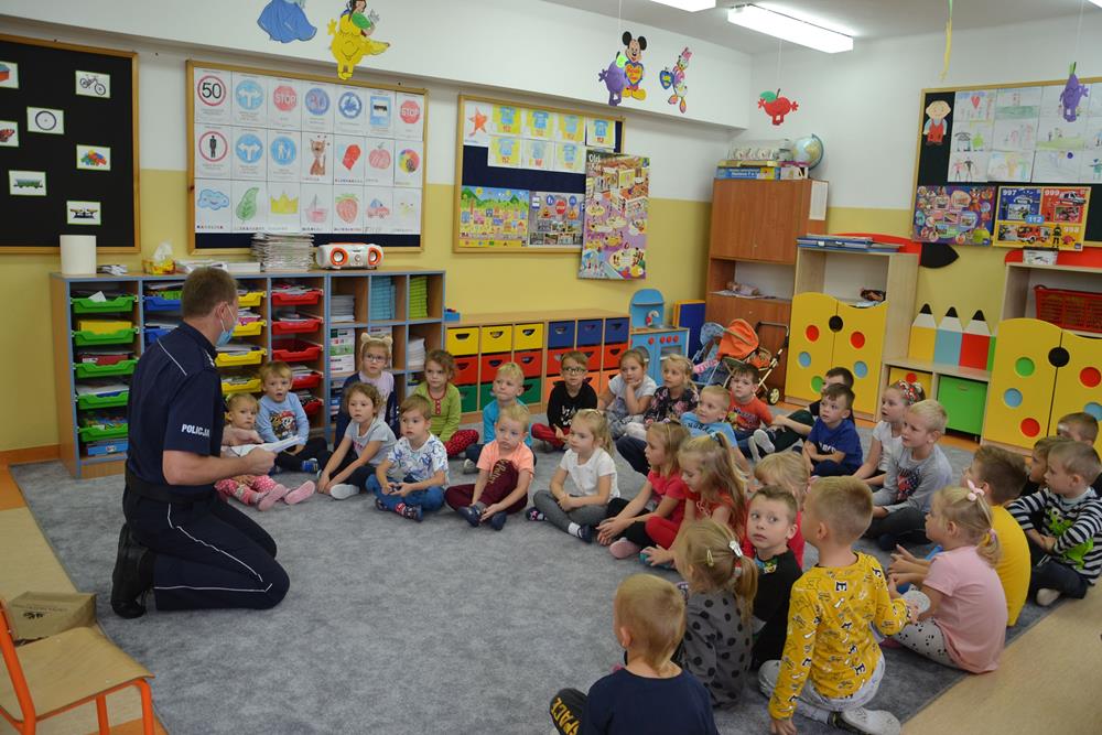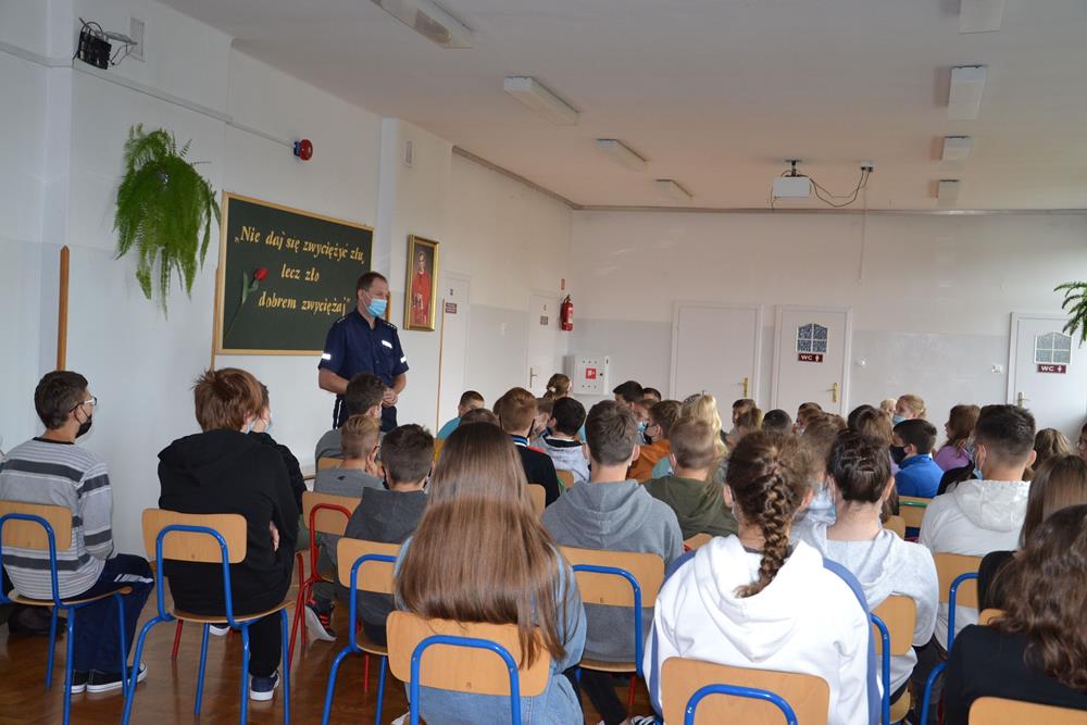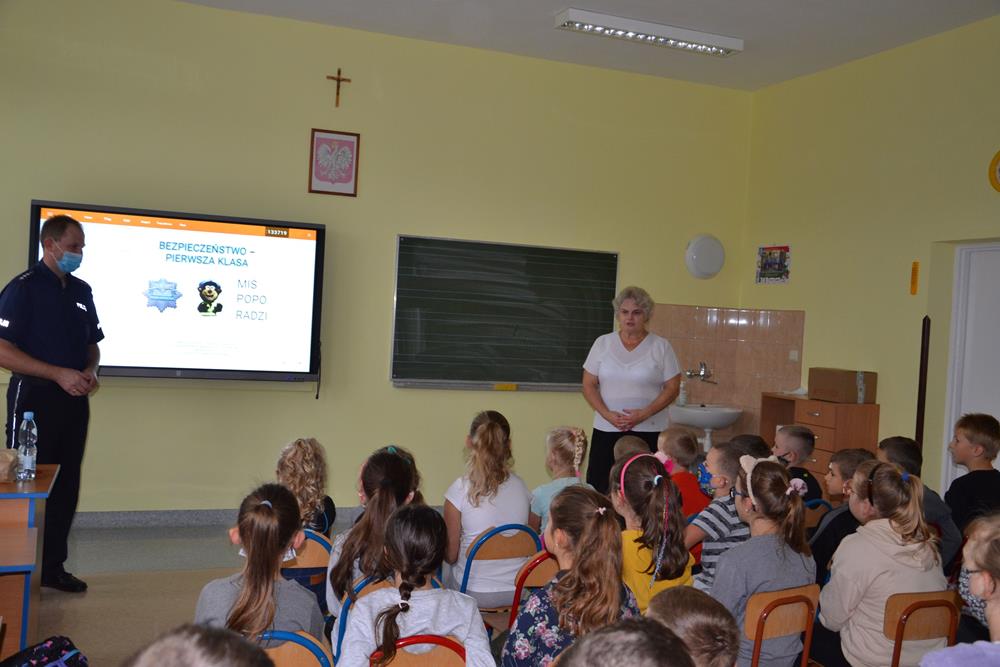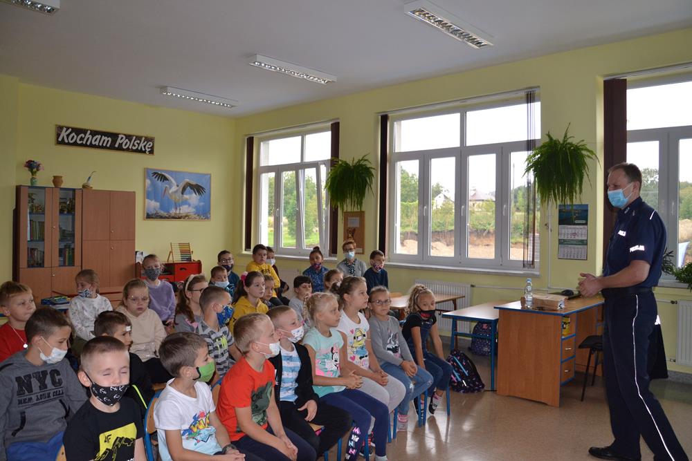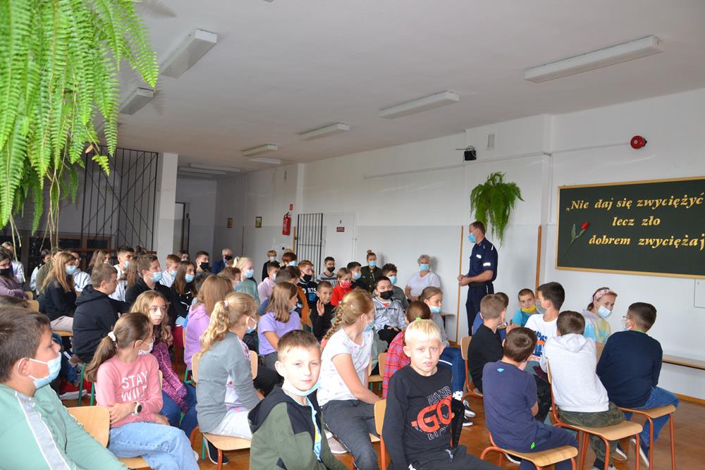W dniu 20 września naszą szkołę odwiedził policjant z Komendy Powiatowej w Przeworsku – starszy aspirant Mariusz Czyrny. Pan policjant spotkał się z uczniami, by omówić ważne kwestie dotyczące bezpieczeństwa, między innymi: bezpieczeństwa na drodze, w domu, podczas zabawy, podczas wakacji oraz bezpieczeństwa w sieci i cyberprzemocy. Spotkania odbyły się w trzech grupach: przedszkole, klasy I-III, klasy IV-VIII, aby można było omówić ważne kwestie związane z bezpieczeństwem w sposób przystępny dla odbiorców w różnych grupach wiekowych. Uczniowie słuchali z zainteresowaniem pana policjanta, zadawali interesujące ich pytania i aktywnie brali udział w dyskusji. Bardzo serdecznie dziękujemy Panu Mariuszowi za spotkanie.