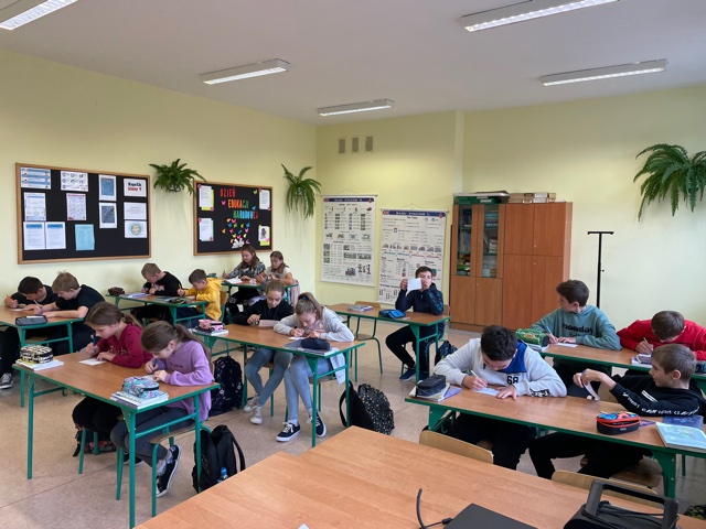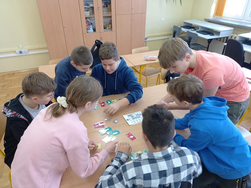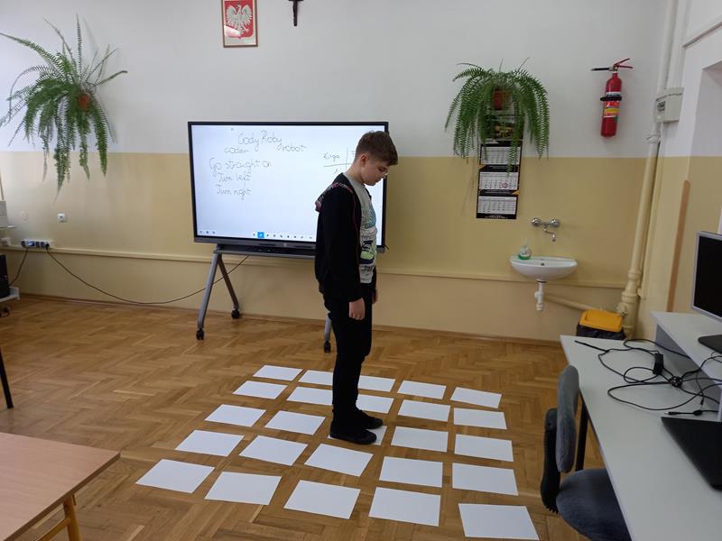 Uczniowie klasy VI wzięli udział w grze CodyRoby. Polegała ona na ułożeniu poleceń do wyznaczonej drogi na małej planszy, tak aby robot dotarł do celu. Prawidłowość kolejności wykonania poleceń sprawdzana była na dużej planszy na podłodze, po której chodzili uczniowie. Polecenia wydawane były po angielsku, dodatkowo uczniowie odpowiadali na pytania związane z gramatyką języka angielskiego. Wszyscy uczniowie bardzo zaangażowali się w zajęcia, które pomogły rozwinąć umiejętność kodowania, a także używania języka angielskiego w praktycznych sytuacjach.