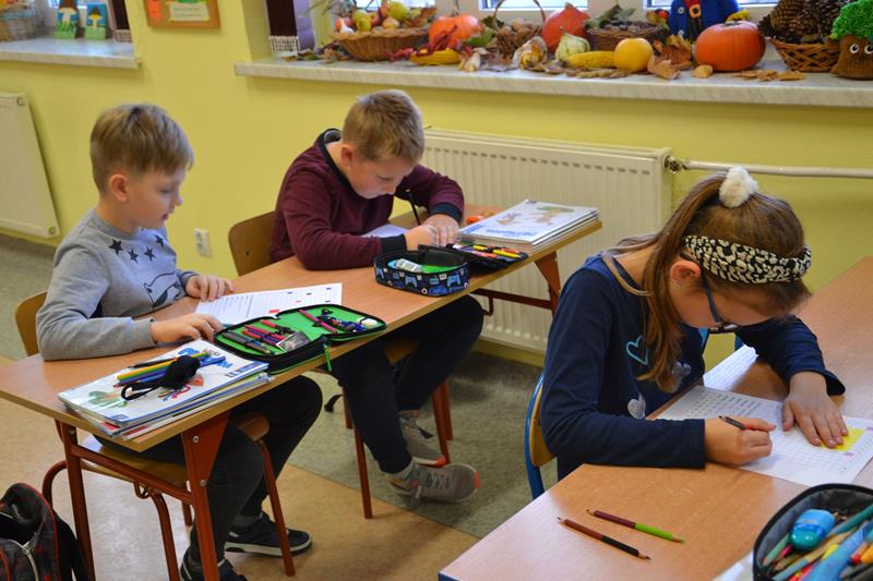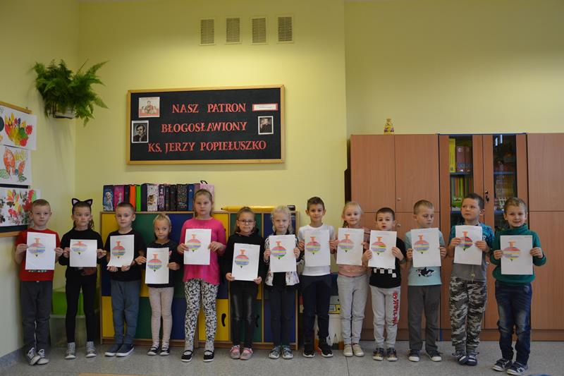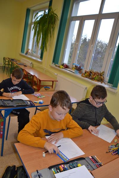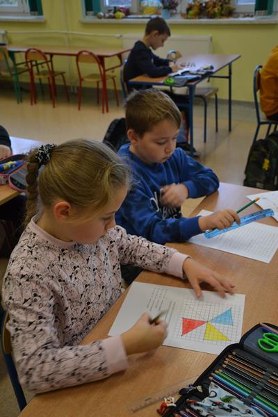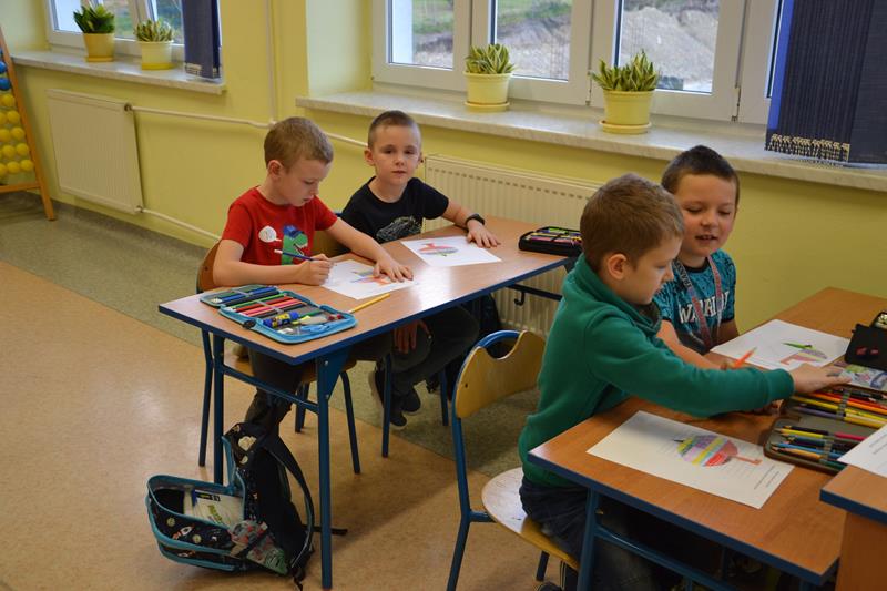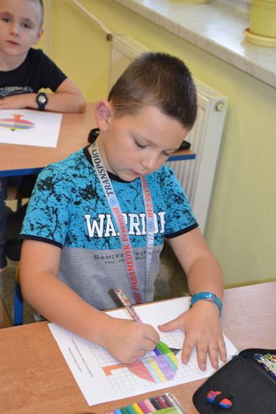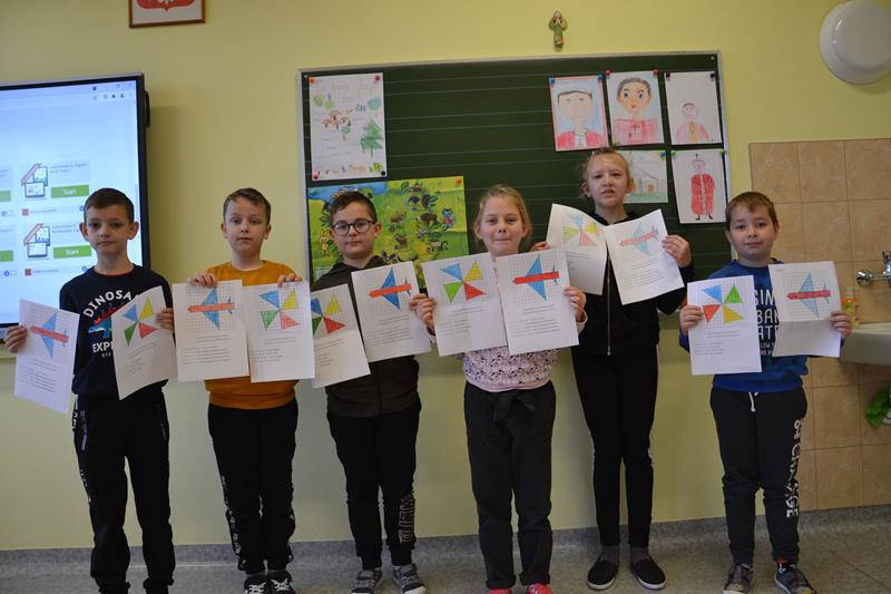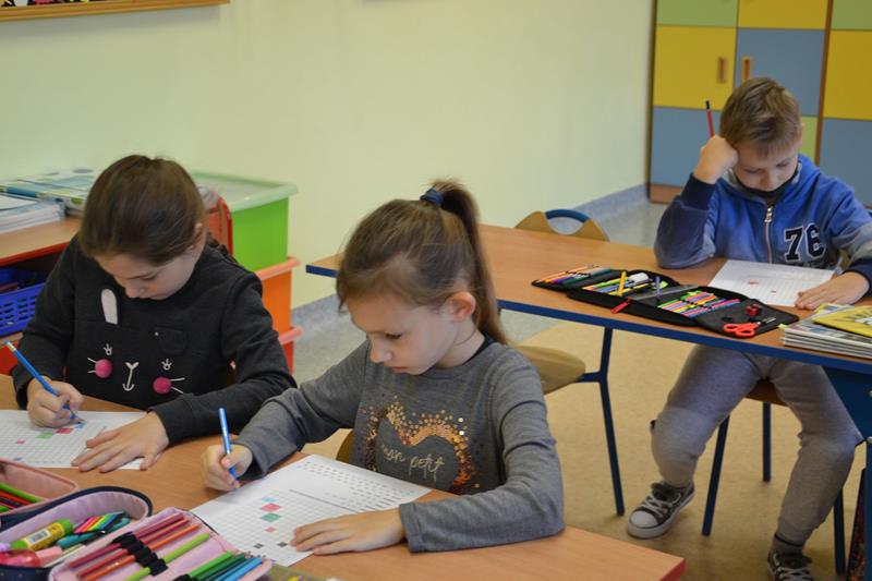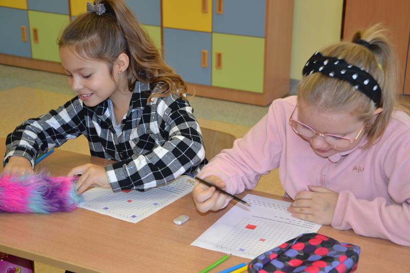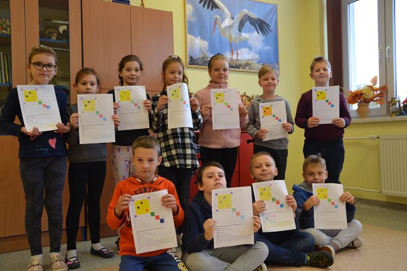 W klasach I –III odbyły się zajęcia pod hasłem „W kolorowym świecie zabawek - kodowanie”. Uczniowie wykonywali kolorowe rysunki zabawek ukryte pod odpowiednimi kodami. Klasa I wyszukiwała na podstawie podanych współrzędnych odpowiednie kratki, które następnie zamalowywano właściwym kolorem. Klasa II wykonywała lustrzane odbicie fragmentu zabawki poprzez odszukanie odpowiednich pól do zamalowania. Natomiast klasa III wykonywała rysunek ołówkiem poprzez łączenie wskazanych punktów na na siatce współrzędnych, a następnie wypełnienie określonych przestrzeni wskazanymi kolorami. Podczas wykonywania tych zadań uczniowie doskonalili koordynację wzrokowo – ruchową, umiejętności grafomotoryczne, orientację przestrzenną i koncentrację uwagi. Było to też dla nich doskonałe ćwiczenie rozbudzające wyobraźnię oraz dające radość i satysfakcję z samodzielnego wykonania ciekawego obrazka.