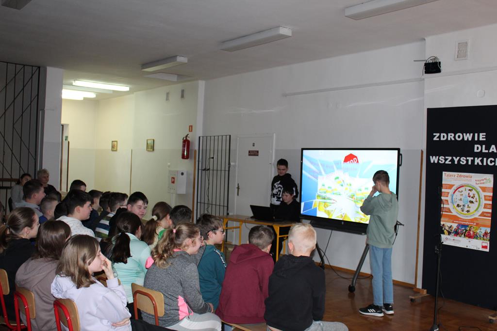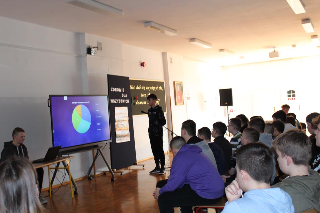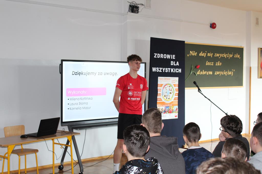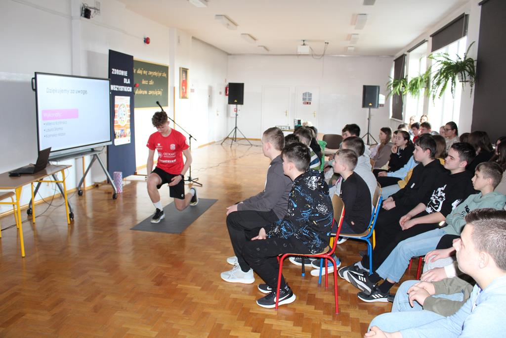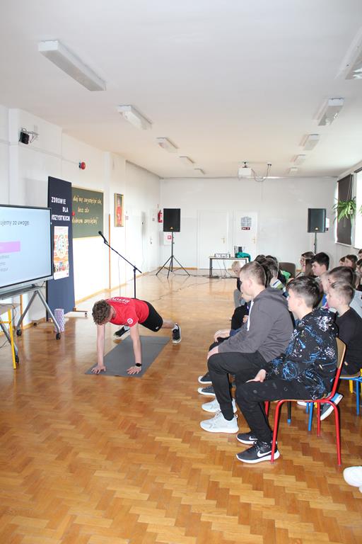 Nawiązując do 75 rocznicy powstania WHO, w naszej szkole obchodziliśmy Światowy Dzień Zdrowia pod hasłem: „Zdrowie dla wszystkich”. Uczniowie klasy VI przygotowali na tę okazję prezentacje dotyczące właściwego odżywiania, dbałości o sylwetkę, świadomości dotyczącej tego, co jemy oraz zaburzeń wynikających z niewłaściwego podejścia do tematu żywienia. Gościliśmy również ucznia Szkoły Mistrzostwa Sportowego „Resovia”, który ubogacił ten dzień przedstawiając kilka ćwiczeń poprawiających naszą kondycję i samopoczucie. Na zakończenie przeprowadzono konkurs sportowy, w którym wybrani uczniowie mogli zaprezentować swoją tężyznę fizyczną w konkurencji wytrzymałościowej. Mistrzami „plank” w naszej szkole zostali: Kornelia Mazur i Dawid Chmiel. Gratulujemy!