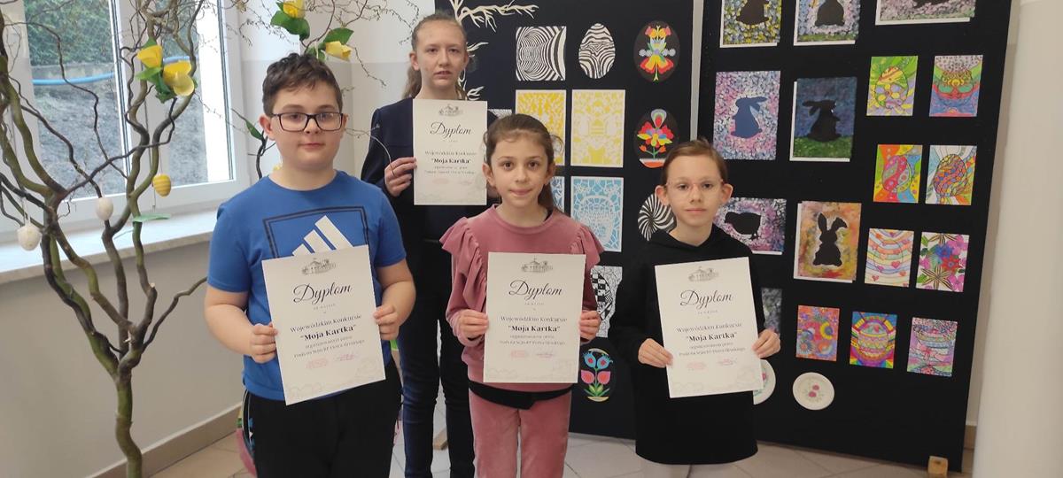 Uczniowie naszej szkoły Klaudia Czerniecka, Nikola Panek, Agata Krypel, Karol Jacek i Igor Markowicz, wzięli udział w konkursie artystyczno - literackim "Moja Kartka". Zadaniem konkursowym było wykonanie kartki wielkanocnej w dowolnej technice plastycznej, nawiązującej motywem do polskiej tradycji, sztuki i kultury regionu. Każdy uczestnik konkursu wewnątrz kartki umieszczał własnoręcznie napisane autorskiej treści życzenia świąteczne.