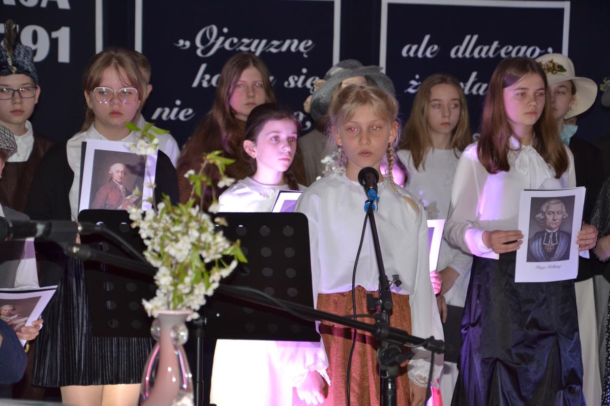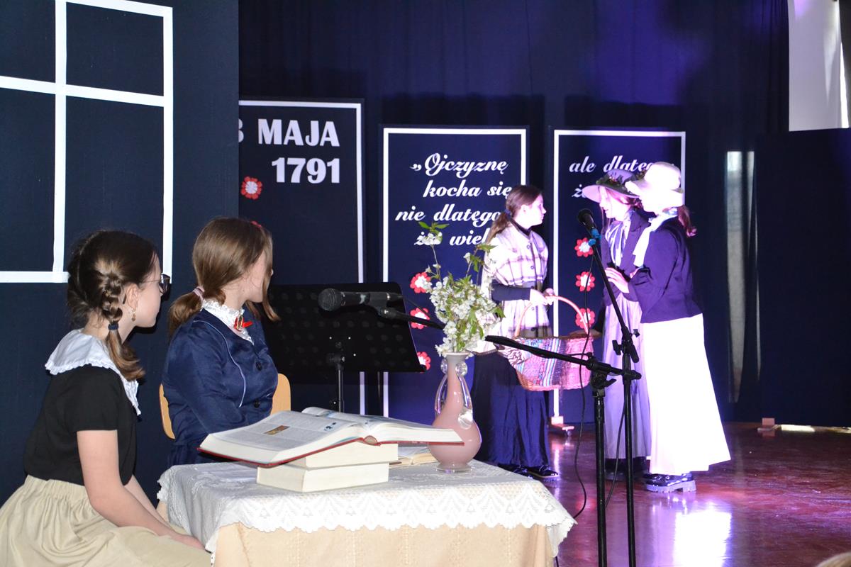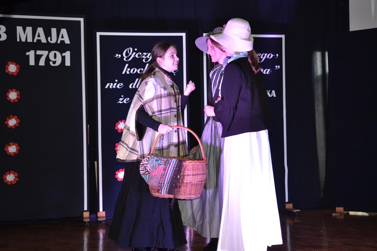 Motywem przewodnim przedstawienia była scena z XIX wieku, rozmowy matki (w tej roli Kornelia Mazur) z córką (Rozalia Mazur). Matka, pamiętająca czasy niepodległego państwa polskiego, starała się wytłumaczyć córce okoliczności uchwalenia Konstytucji 3 maja oraz przyczyny upadku Polski. „Przenosząc się w czasie”, można było zobaczyć kłótnię przeciwnika konstytucji Klemensa Branickiego (Hubert Grocholski) ze zwolennikami naprawy państwa (Oliwier Gwóźdź oraz Igor Markowicz). Atmosferę oczekiwania na ważne decyzje 1791 roku zaprezentowały również mieszczki (Milena Kotlińska, Zuzanna Piątek oraz Marcelina Bukowy), które rozprawiały o wielkich czynach sejmujących. Na koniec marszałek Sejmu Wielkiego – Stanisław Małachowski (Bartosz Babik) odczytał tekst Konstytucji. Całość przedstawienia dopełniły wiersze (wyk. Patrycja Hołub, Mikołaj Mazur, Oliwier Gwóźdź) i piosenki (wyk. Julitka Wojdyła, Zosia Kisiel, Marcelina Bukowy, chórek szkolny).
