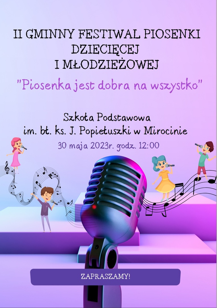 REGULAMIN - II Gminny Festiwal Piosenki Dziecięcej i Młodzieżowej Piosenka jest dobra na wszystko [17.50 kB] zał. nr 1 KARTA ZGŁOSZENIA - Gminny Festiwal Piosenki [13.22 kB] zał. nr 2 ZGODA NA WYKORZYSTANIE WIZERUNKU I DANYCH OSOBOWYCH [16.06 kB]