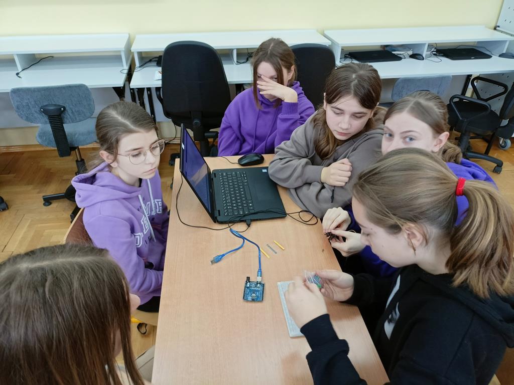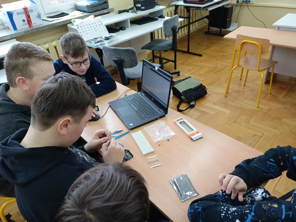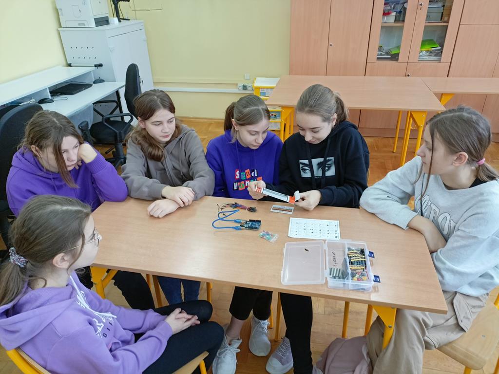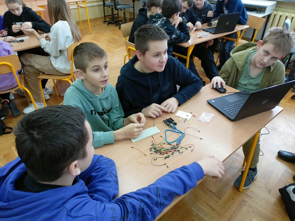 Na zajęciach techniki w klasie VI uczniowie w ramach realizacji zadań z działu elektroniki, montowali obwody elektroniczne, programowali układ scalony wykorzystując zestaw Arduino Uno i dedykowaną aplikację do programowania w języku C++.