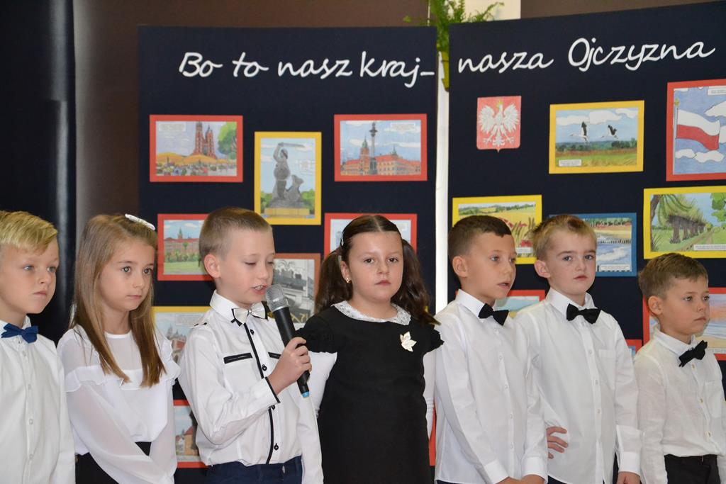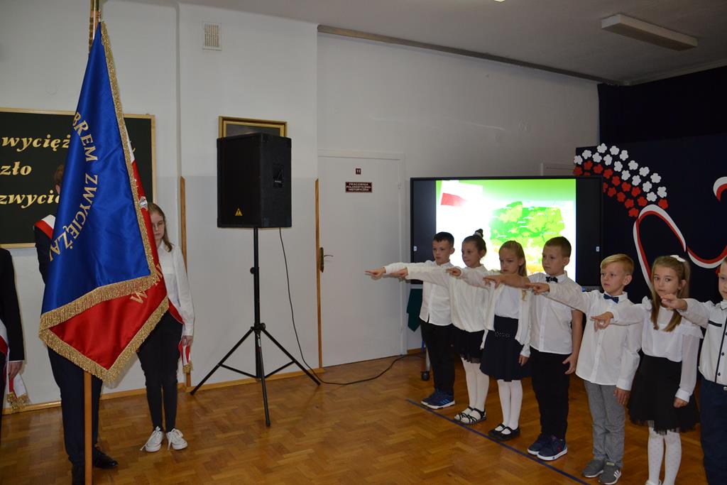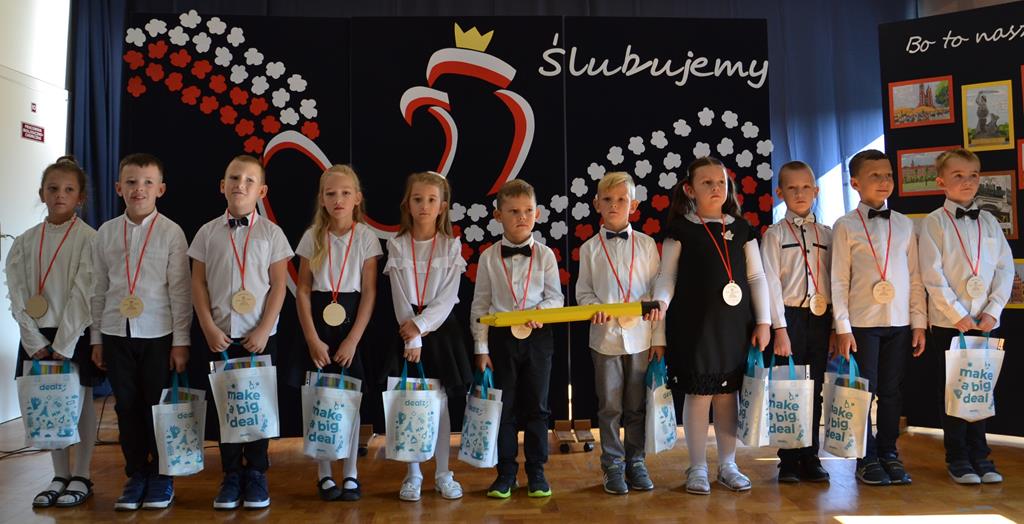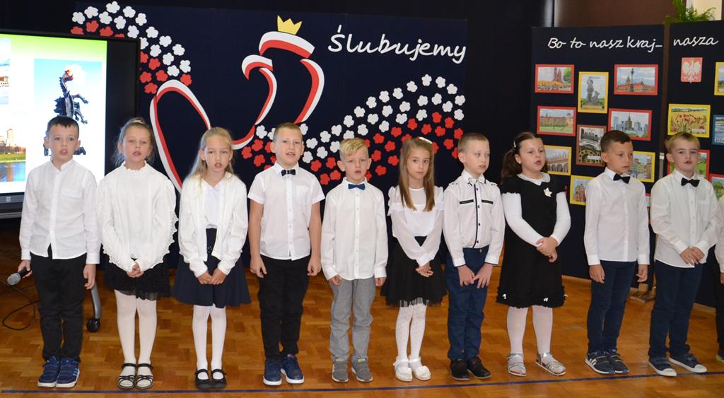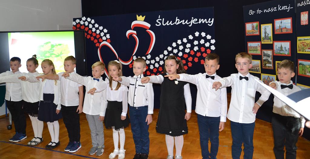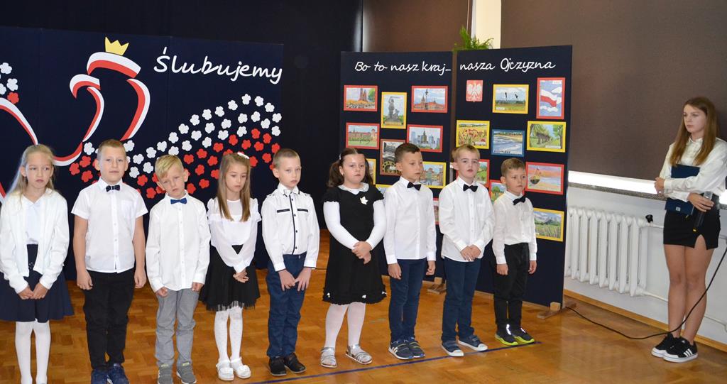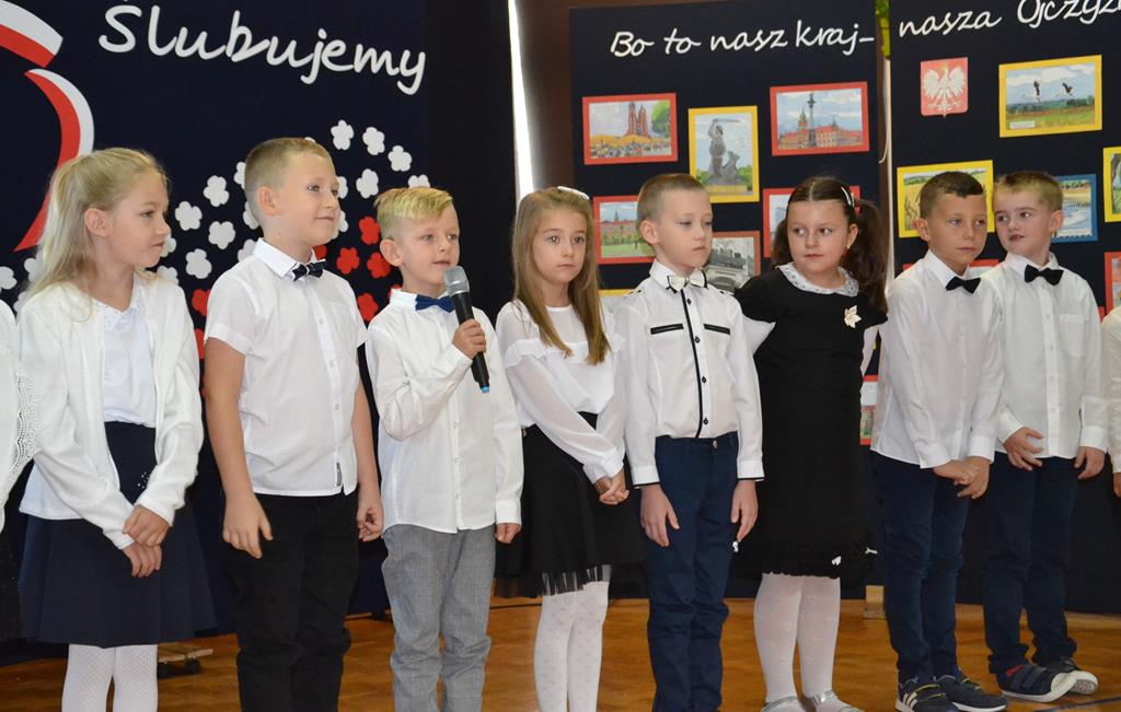 W dniu 13 października (piątek) dzieci z klasy I zaprezentowały całej społeczności szkolnej oraz zgromadzonym rodzicom krótki montaż słowno – muzyczny związany tematycznie z naszą Ojczyzną jako niezwykłym miejscem do życia. Następnie za pośrednictwem przewodniczącej szkoły poprosiły panią Dyrektor o przyjęcie do grona uczniów. Uroczyste pasowanie poprzedziło równie uroczyste ślubowanie na sztandar szkoły, w którym pierwszoklasiści zobowiązali się do wyrażania swoją postawą i zachowaniem szacunku dla szkoły, klasy oraz dbania o honor Ojczyzny. Obiecali wzorowo wypełniać szkolne obowiązki i dawać innym przykład. Życzymy im z całego serca wytrwania w tym przyrzeczeniu i sukcesów w dalszej drodze edukacji – wszak przed nimi całe 8 lat – a to dopiero początek. Nasi drodzy uczniowie klasy I witamy Was serdecznie w naszym gronie, służymy radą, pomocą i wsparciem. Czujcie się dobrze w naszej szkolnej rodzinie, rozwijacie pasje, zainteresowania, odnoście sukcesy, abyśmy wszyscy mogli napawać się dumą, że jesteście wśród nas.