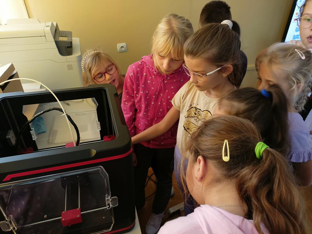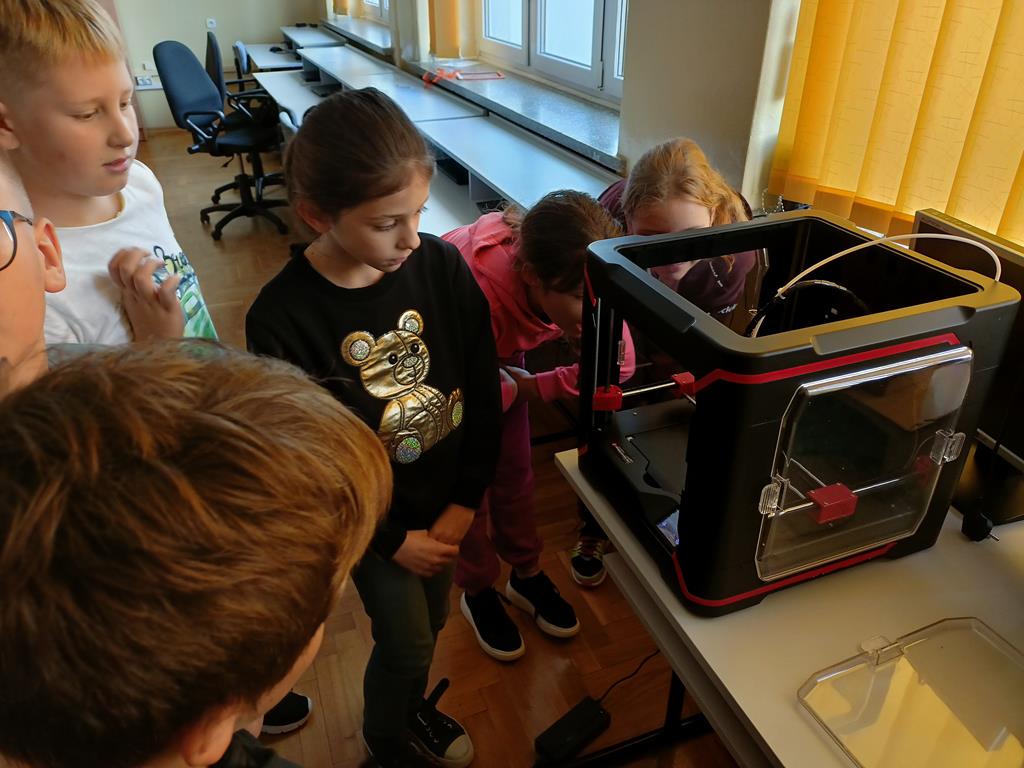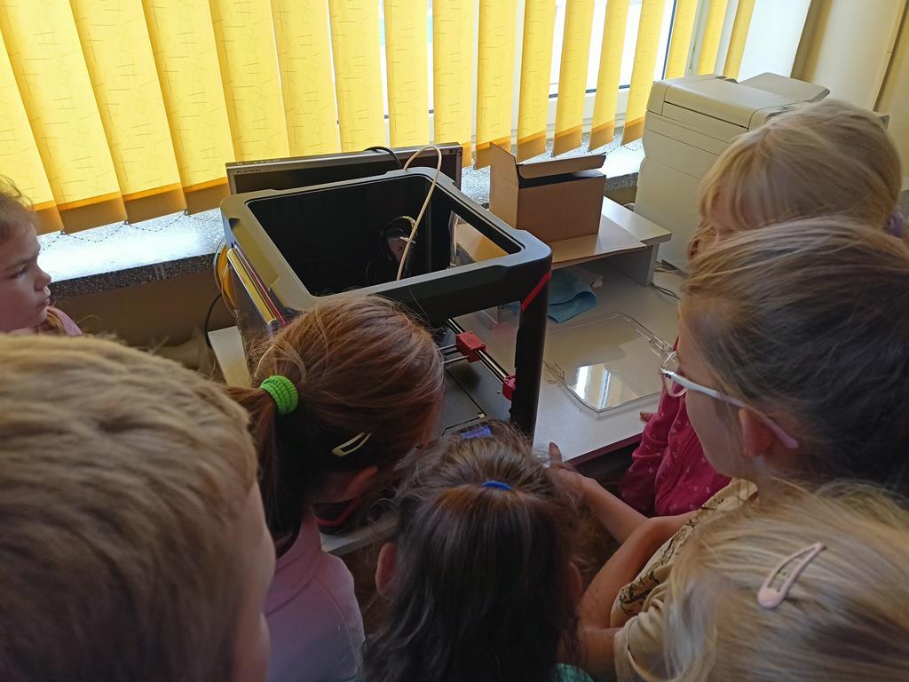 Dzieci zapoznały się z zasadą działania drukarki 3D zakupionej przez szkołę w ramach programu. Uczniowie dowiedzieli się jak przygotować projekty przestrzenne, poznali zasadę działania urządzenia oraz obserwowali proces drukowania modeli 3D.