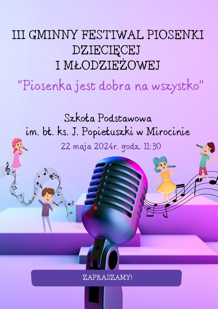 REGULAMIN - III Gminny Festiwal Piosenki Dziecięcej i Młodzieżowej Piosenka jest dobra na wszystko [17.68 kB] zał. nr 1 KARTA ZGŁOSZENIA - Gminny Festiwal Piosenki [13.23 kB]
