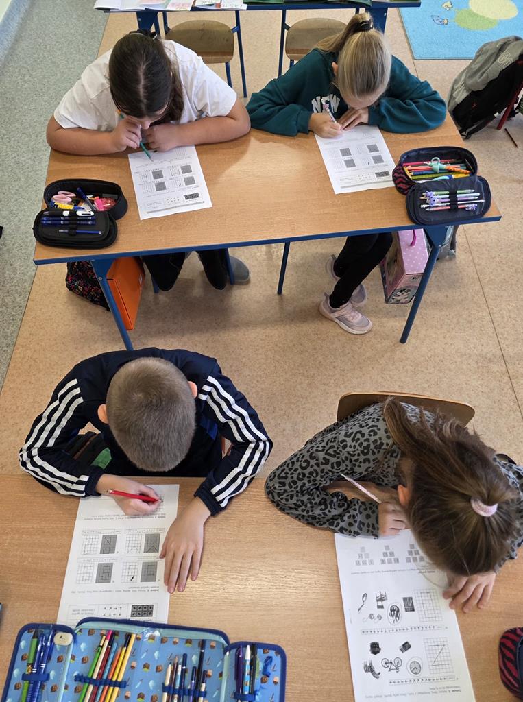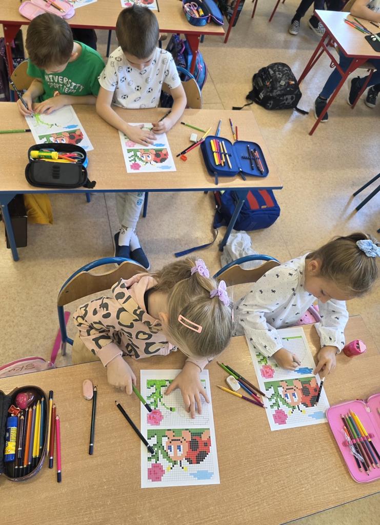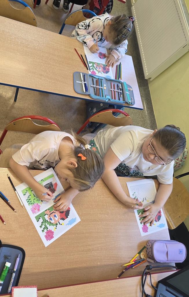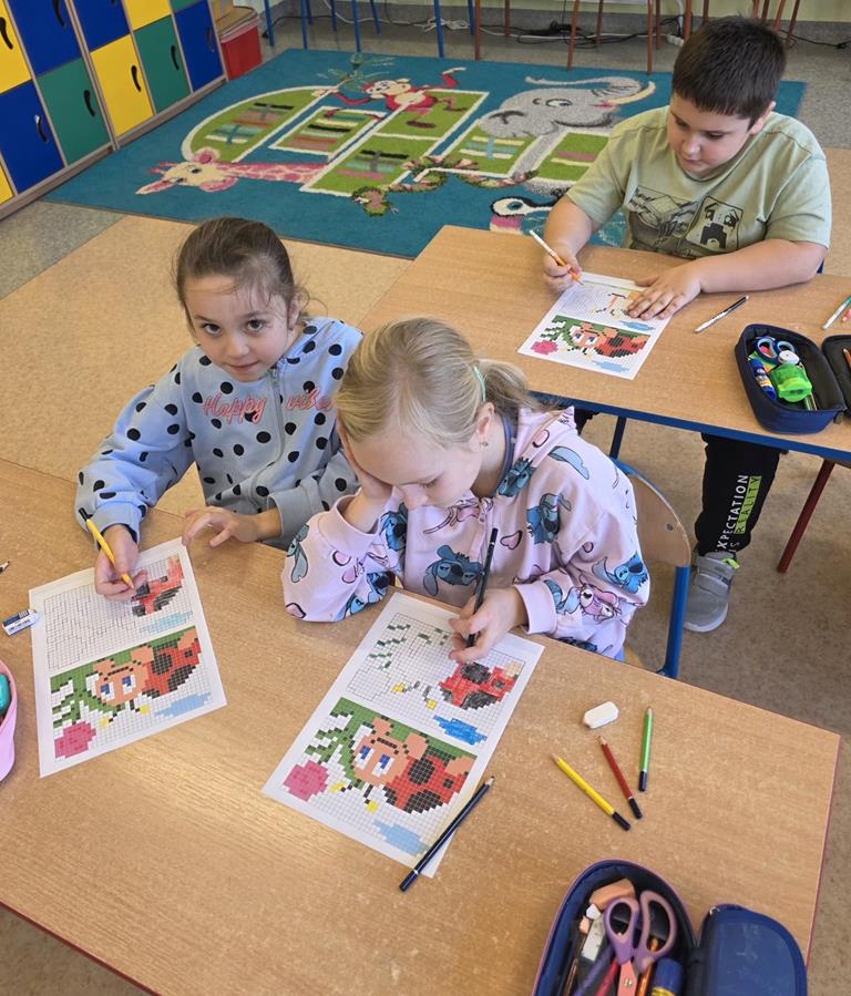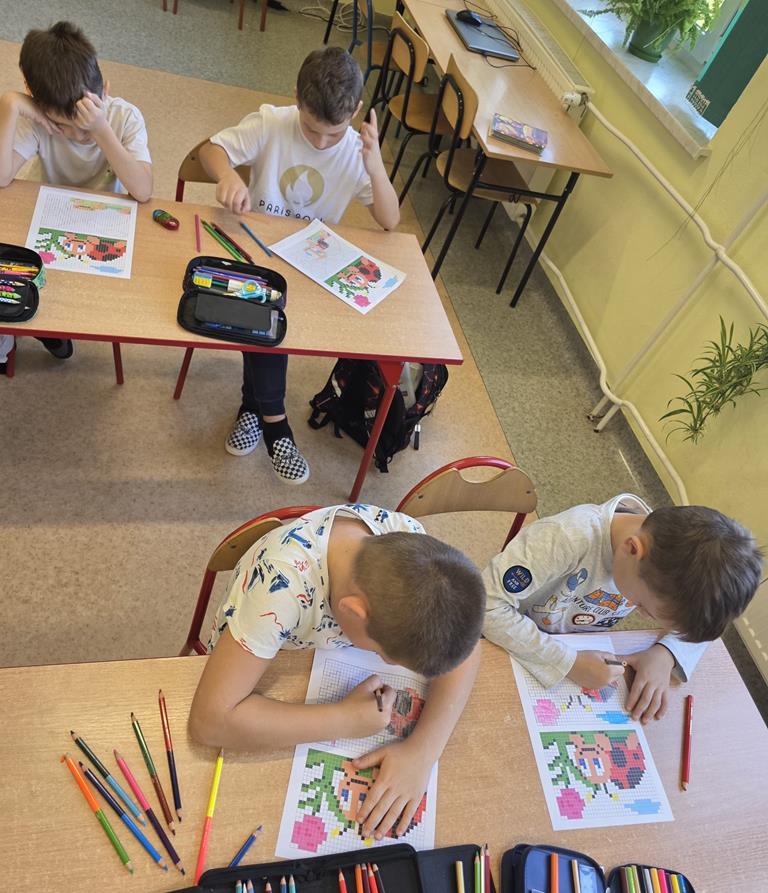 Drugoklasiści tworzyli kolorowe obrazki, wypełniając odpowiednie pola zgodnie z przypisanym kodem