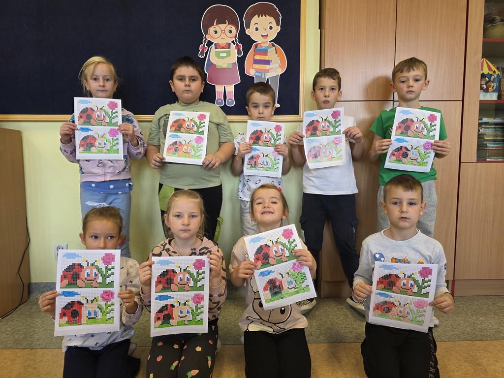 Uczniowie kodowali rysunek biedronki wypełniając kolorami odpowiednie kwadraciki zgodnie ze wskazanym wzorem